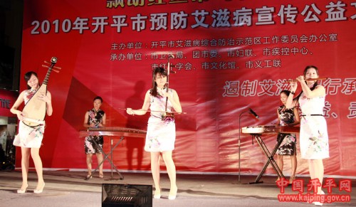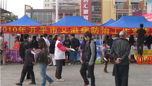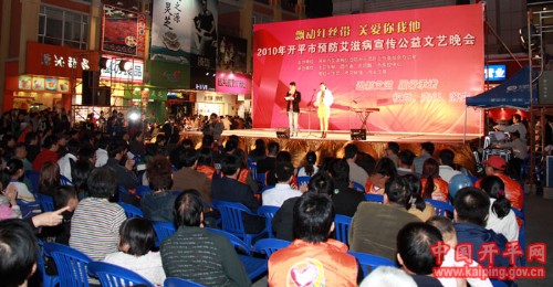 12月7日晚,以“飘动红丝带、关爱你我他”为主题的2010年开平市预防艾滋病宣传公益文艺晚会在市益华广场隆重举行。本次晚会由开平市艾滋病综合防治示范区工作委员会办公室主办,市卫生局、市红十字会、团市委、市妇联、市疾控中心、市文化馆、市义工联承办。