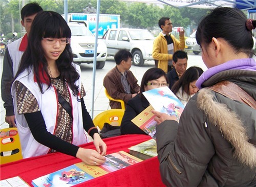 红十字会工作人员和志愿者现场向群众派发宣传资料