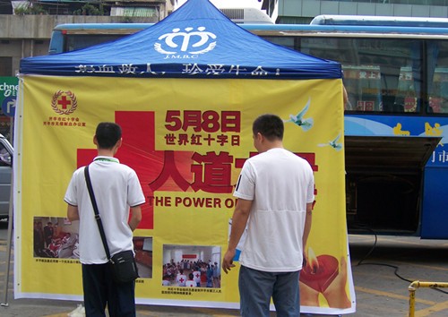 我市红十字会组织红十字志愿者在益华广场开展红十字知识、无偿献血、救护知识宣传活动,并现场接受群众咨询、发放宣传资料。