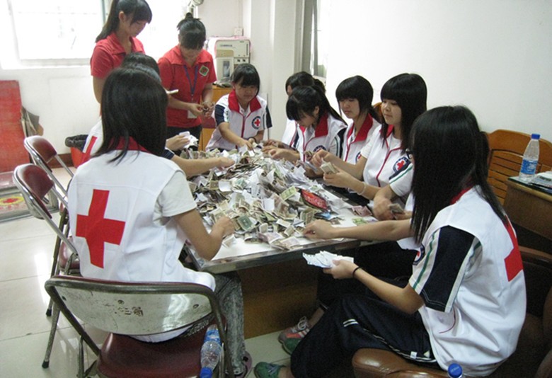 风采中学红十字会了解到我市红十字会需要志愿者参加清点捐款箱工作后,包尚明老师亲自带领10名学生红十字志愿者,来到了捐款箱开箱地点参加清点志愿活动。