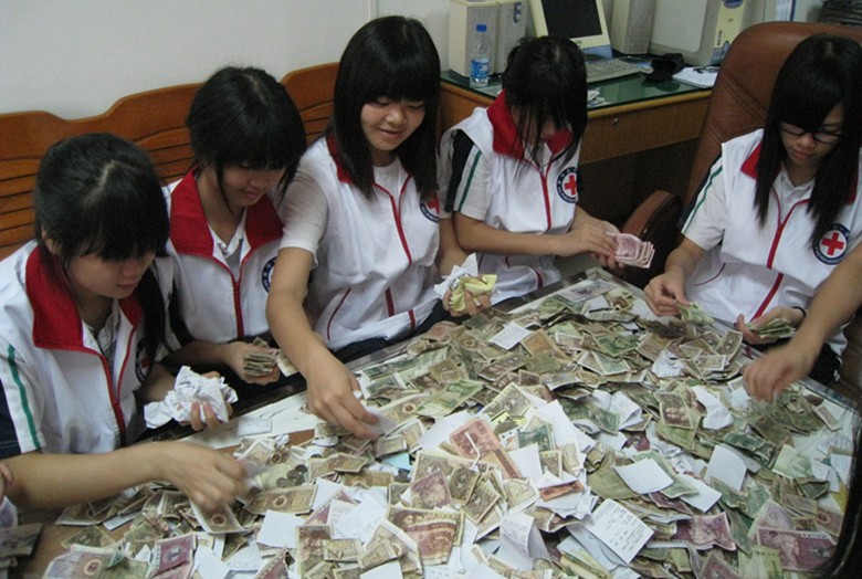清点募捐箱,表面上看只是数数钱而已,其实并没有那么简单。市红十字会的工作人员与超市工作人员一起打开募捐箱,将里面的善款取出来,募集到的零钞,堆在桌面上像一座小山。清点工作该从何入手?熟练的志愿者告诉大家,要分工合作,将杂物去掉,将各种面值的票币分类叠好,用橡皮筋束起来,由专人负责清点张数,并做好登记,以便最后计算总金额。志愿者们都围坐在桌子旁边,埋头整理、清数票币,一直清点了2个多小时才宣告完毕。看看金额,共有1570元,虽然疲惫,大家心里却是暖洋洋的。