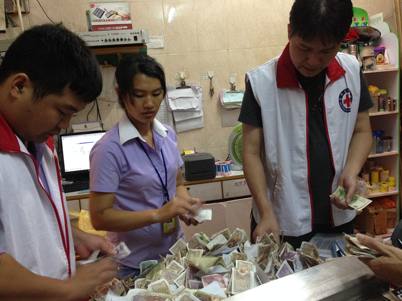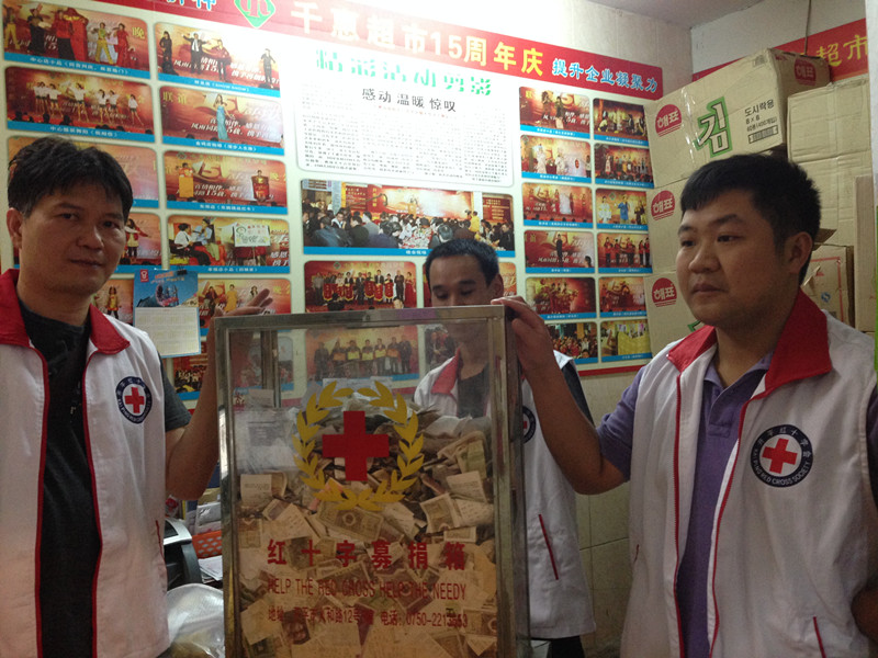 10月21日下午,我市红十字会工作人员及志愿者来到开平市千惠连锁超市幸福分店,在超市代表的监督和帮助下,清点设立在超市门口的爱心捐款箱内的善款。