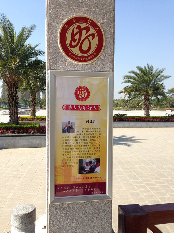 人民公园“开平好人长廊”内42根柱子上,我会志愿服务队副队长何景乐、张培绚同志均榜上有名。