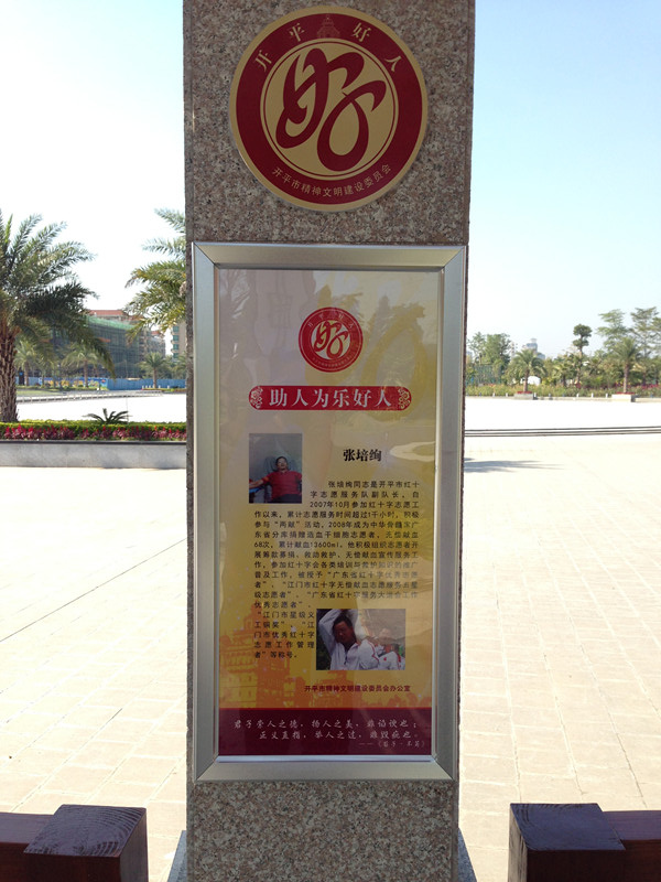 为推进开平市精神文明建设,大力弘扬好人好事迹,充分发挥“开平身边好人”在传递文明、引领新风尚方面的重要作用,形成全市争当好人的良好氛围,我市市委宣传部、文明办于今年10月在人民公园设立“开平好人长廊”,方便市民在悠闲逛公园的同时,也可以学习好人的事迹。