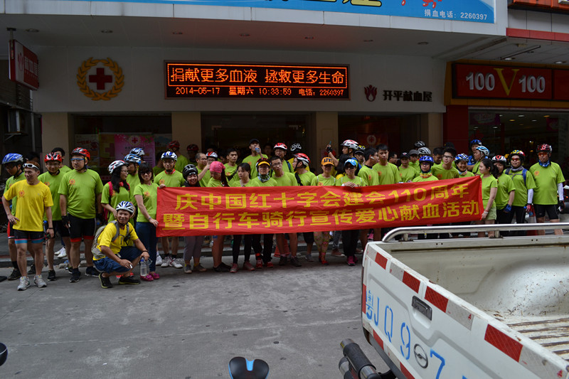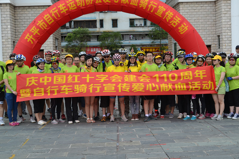 “我健康,我献血!”5月17日上午,开平市红十字会、开平市自行车运动协会共同举办的“庆中国红十字会建会110周年暨自行车骑行宣传爱心献血活动”顺利举行。开平市红十字会常务副会长谭珍金同志亲临现场并鸣笛发令。