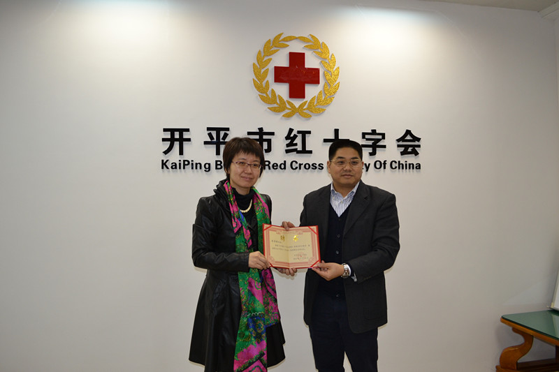 江门市红十字会冯冰常务副会长向余雪俊市长颁发“名誉会长聘书”