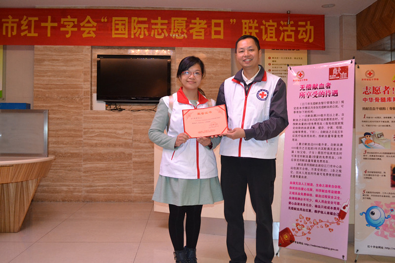 在活动现场,红十字会工作人员对近2年志愿服务队的工作情况做了的总结,对志愿者无怨无悔的奉献精神予以肯定并致以最诚挚的感谢,并对2014-2015年度累计服务工时10小时以上的志愿者颁发了“优秀志愿者”荣誉证书,近30人获此殊荣。