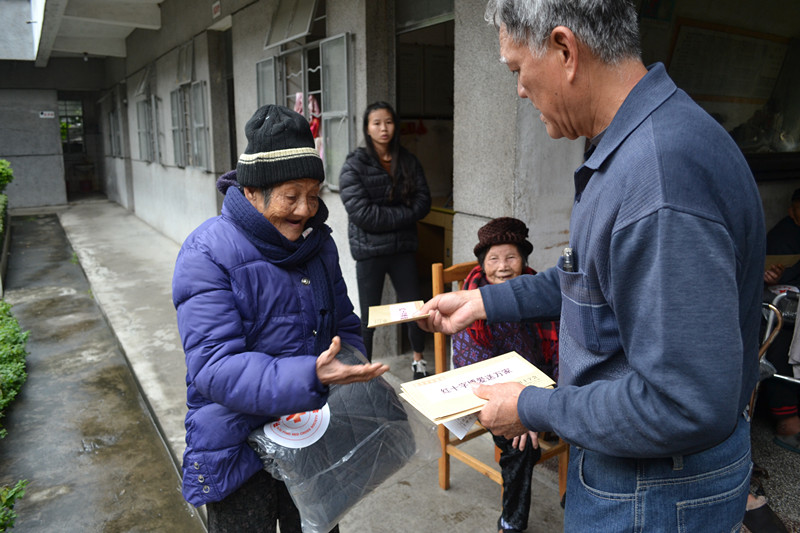 敬老院负责人给老人递上羽绒服和慰问金