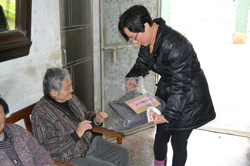 谭珍金副会长给老人送上羽绒服和慰问金