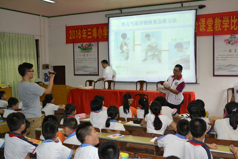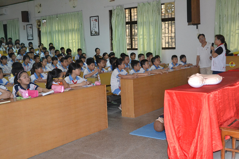 在阶梯教室内,达德小学校长做了开课发言,他强调:青少年儿童是弱势群体,在面对危险时往往会受到更多的伤害,因此大家一定要珍惜此次学习机会,认真听讲,用知识武装自己。在课上,讲师梁玉婵以气道异物梗阻、中暑、烫伤等一些儿童常见急症为主要内容,向大家讲解了这些急症的症状和应对措施,如气道异物的“V”字型标志手势以及几种自救互救的方法,并邀请了学生与老师进行了模拟演示,同学们对这些知识十分感兴趣,积极与老师进行互动提问,现场气氛十分活跃。