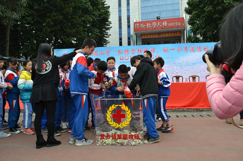 达德小学各年级收集捐款倒进回收箱