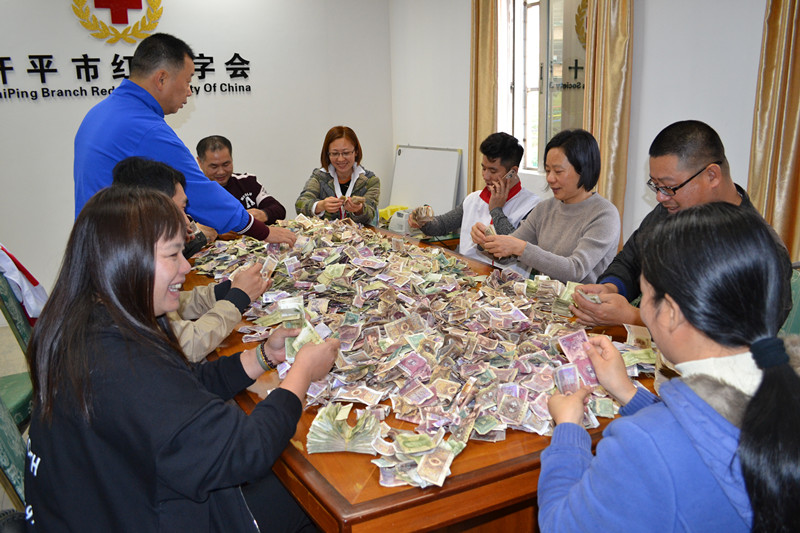 工作人员和志愿者清点善款