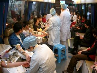 记者在崭新的采血车上,见到了一幕幕动人的场景:数十人将采血人员围得水泄不通;有姑娘陪着男友来的,有同班同学结伴来的;有保安人员,有打工小伙,有时髦女郎,还有待岗人员,等等。他们争相咨询、填表、量血压、搞化验,一派热闹景象。捐血车内,也排满了等待采血的人们。更可喜的是,在献血人群中,大部分是多次献血的。其中有一个年轻小伙子是从龙胜特意打的赶来。细心的采血人员为无偿献血者配备了饮料、纪念品等,热情周到的服务,使捐血车内洋溢着温暖。