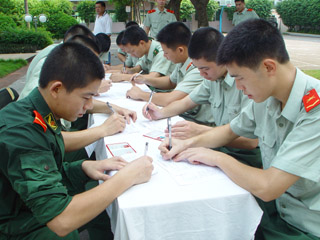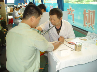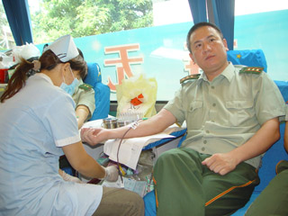 当天上午,在市边检站内,停放着一辆江门市中心血站的大巴车,车身上,“无偿献血 重铸生命” 几个鲜红的大字特别显眼。车子四周,官兵们围住医务人员,争先恐后地进行填表、测血型、量血压等献血前的准备工作。献血的队伍中有该站的领导、机关干部和基层官兵,还有女兵。而该站罗煦春站长更是带头挽袖献血。望着从手臂上流出的汩汩热血,官兵们感到既骄傲又自豪!据统计,自1997年至今,边检站共有156位官兵献出共34000毫升热血,这充分体现了人民子弟兵对社会公益事业的关心。