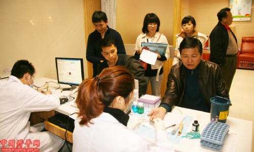 对献血者进行初筛(包括体检、量血压、听心肺等,取手指血约10分钟后出结果)