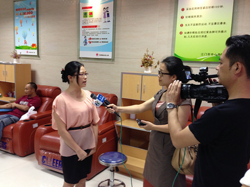 正在献血屋接受现场采访
